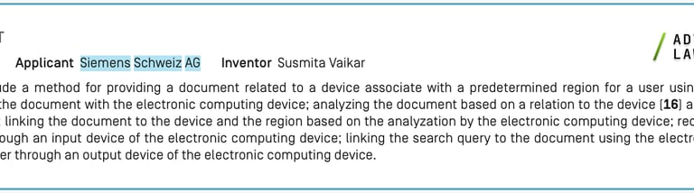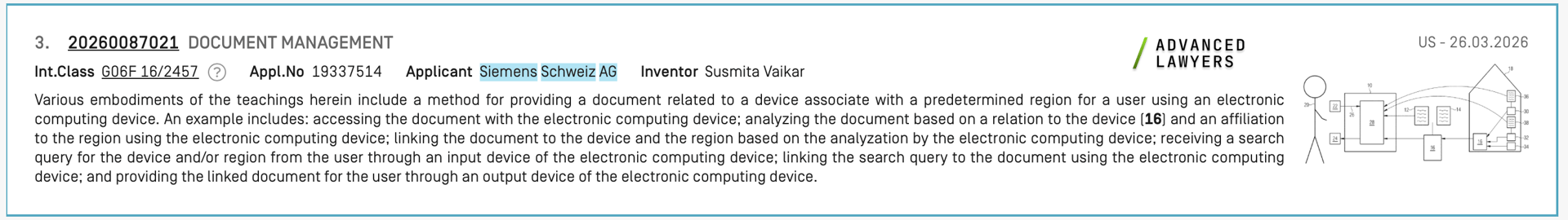 В ходе поиска мы обнаружили одну из недавних патентных заявок, связанную с IT-технологиями в области обработки и управления документами с использованием искусственного интеллекта, где заявителем выступает штаб-квартира Siemens. По нашему предварительному анализу, речь идёт о патенте, описывающем сложный бизнес-процесс, в основе которого лежит ИИ, способный обрабатывать большие массивы данных, структурировать их и выдавать релевантный результат.